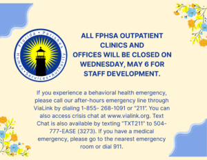 All FPHSA Outpatient Clinics and Offices will be closed on Wednesday, May 6 for staff development. If you experience a behavioral health emergency, please call