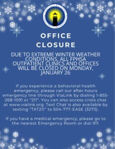 Due to extreme winter weather conditions, all FPHSA outpatient clinics and offices will be closed on Monday, January 26, 2026. If you experience a behavioral