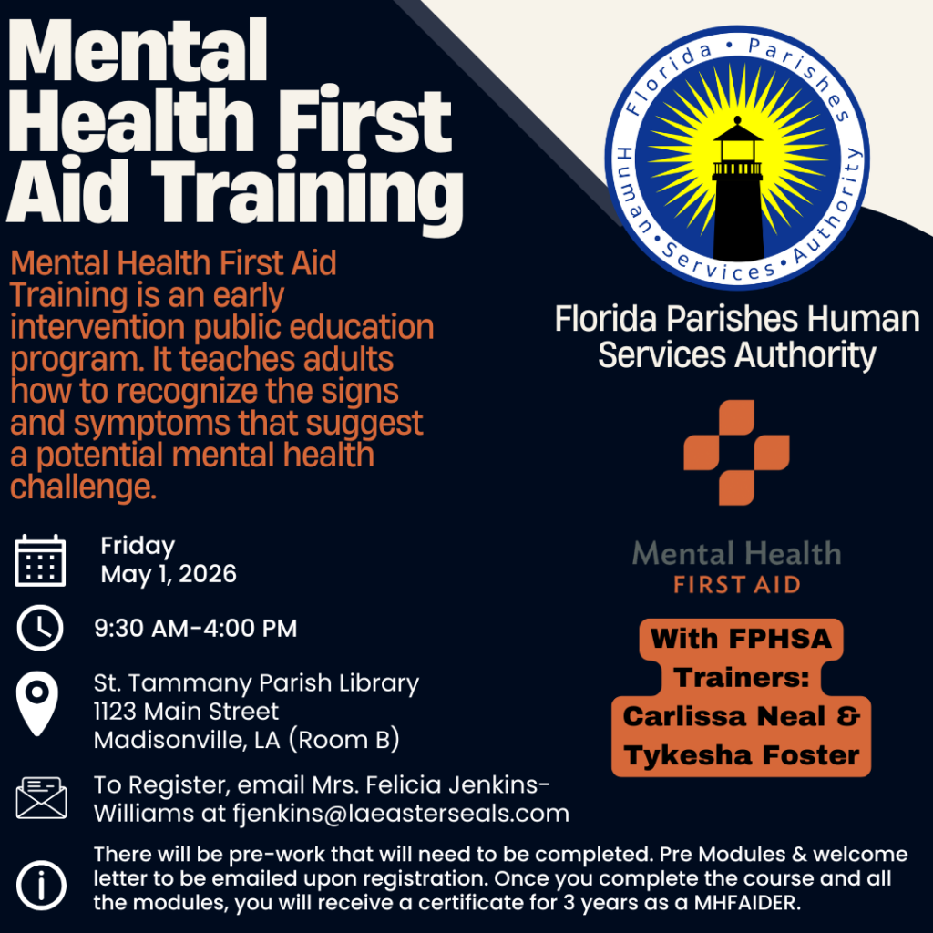 Florida Parishes Human Services Authority invites community members to participate in Mental Health First Aid Training, an evidence‑based public education program that teaches adults how to recognize the signs and symptoms of a potential mental health challenge and how to respond appropriately.