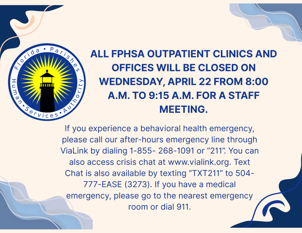 All FPHSA Outpatient Clinics and Offices will be closed on Wednesday, April 22 from 8:00 a.m. to 9:15 a.m. for a staff meeting.